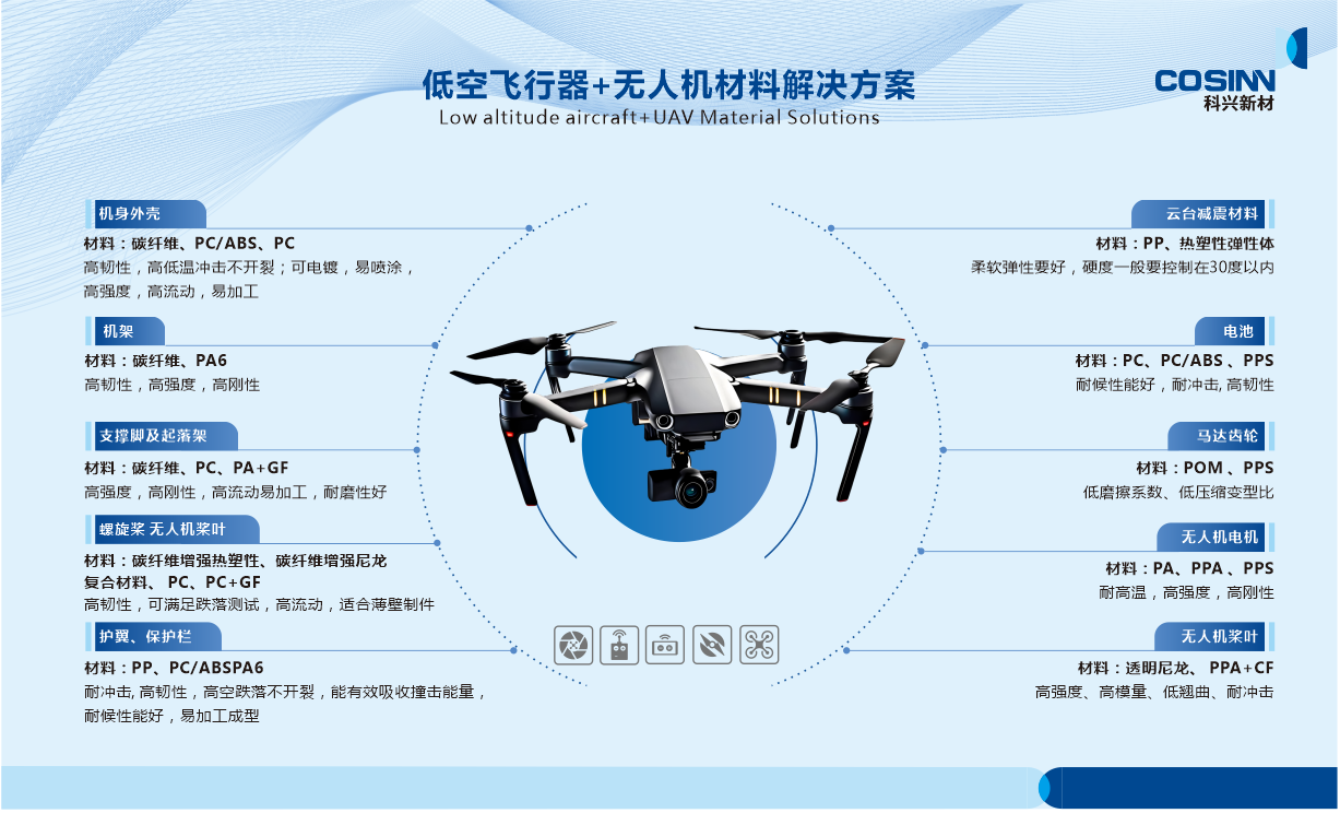 综上所述,科兴新材的PPS和PA材料在无人机领域的应用展现了其卓越性能和广泛应用潜力,为无人机的轻量化、高强度和耐候性提供了有力支持,进一步推动了低空经济的发展。